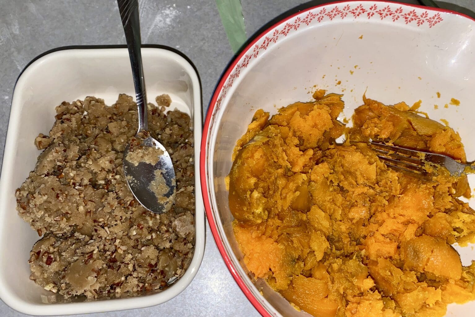 Spread the sweet potato mixture evenly into the prepared dish. Sprinkle the brown sugar pecan topping over the surface.