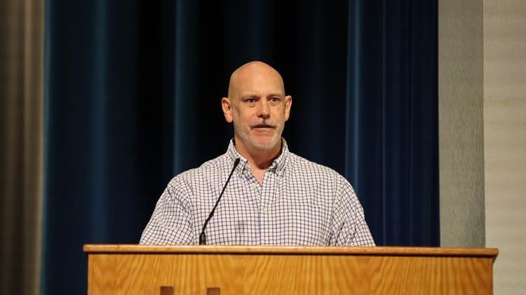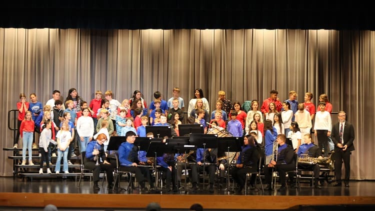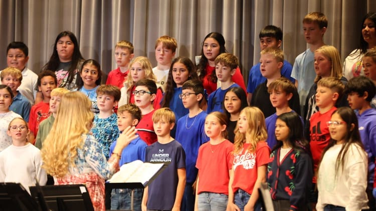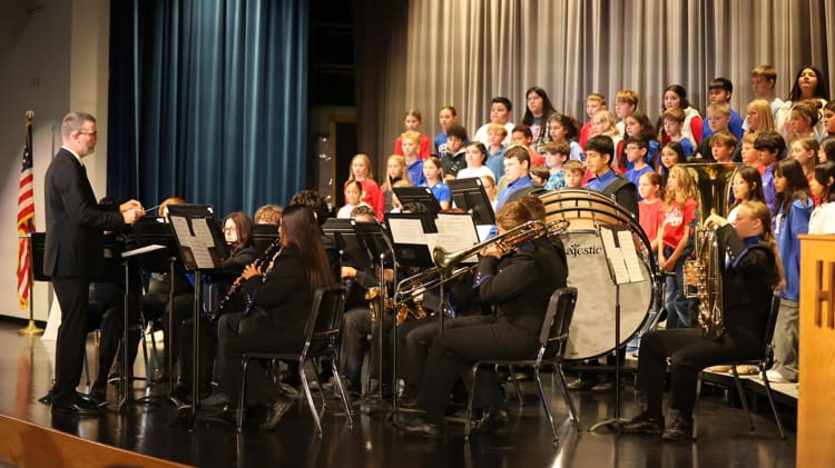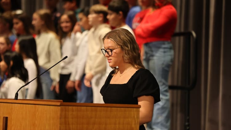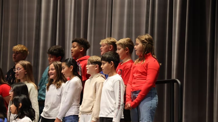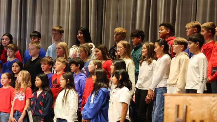 From there, students guided the entire program. Jaryn Dowell shared the history of Veterans Day, and the 5th- and 6th-grade choir followed with โOne Nation,โ a song they have been working on since early fall. Guest speaker Mr. Terry Sherrill then spoke about his time in the Air Force and encouraged students to think about the many opportunities waiting for them after high school.