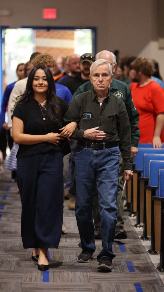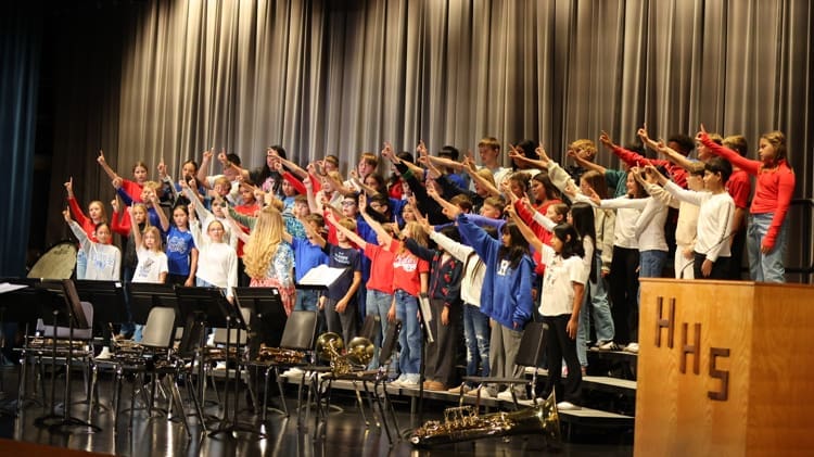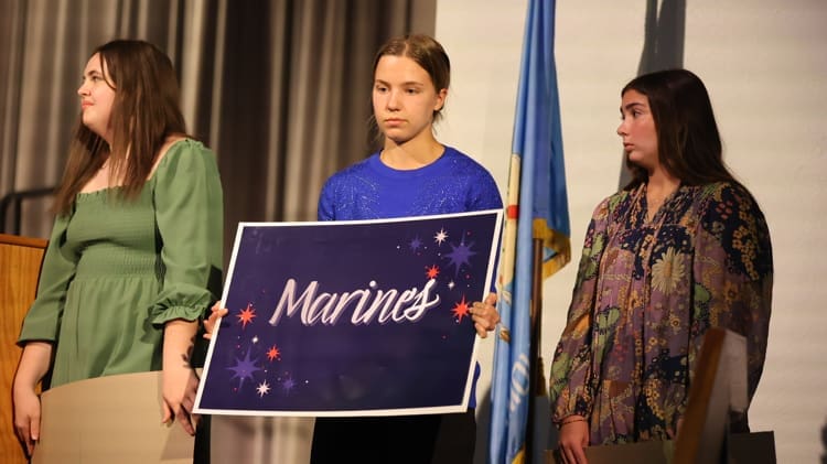 The assembly opened with Mr. Faulkner welcoming everyone, followed by National Honor Society students escorting the veterans to their seats, a responsibility they take seriously and prepare for with pride. After Leilie Vadder led the Pledge of Allegiance, the Pride of Hennessey Band, directed by Mr. Powers, performed the National Anthem, a piece they had been rehearsing for weeks.
