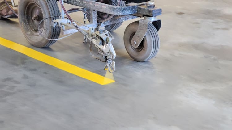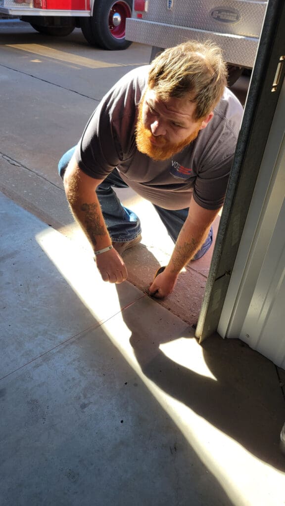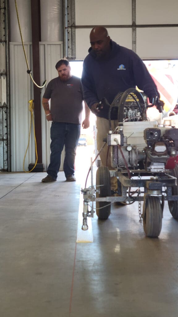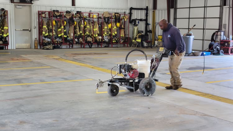 With the bays cleared out, Town of Town of Hennessey crew members Jamie Keel and Kyle Watkins got to work lining out the fire station. And yes, we mean that in the most literal way possible.