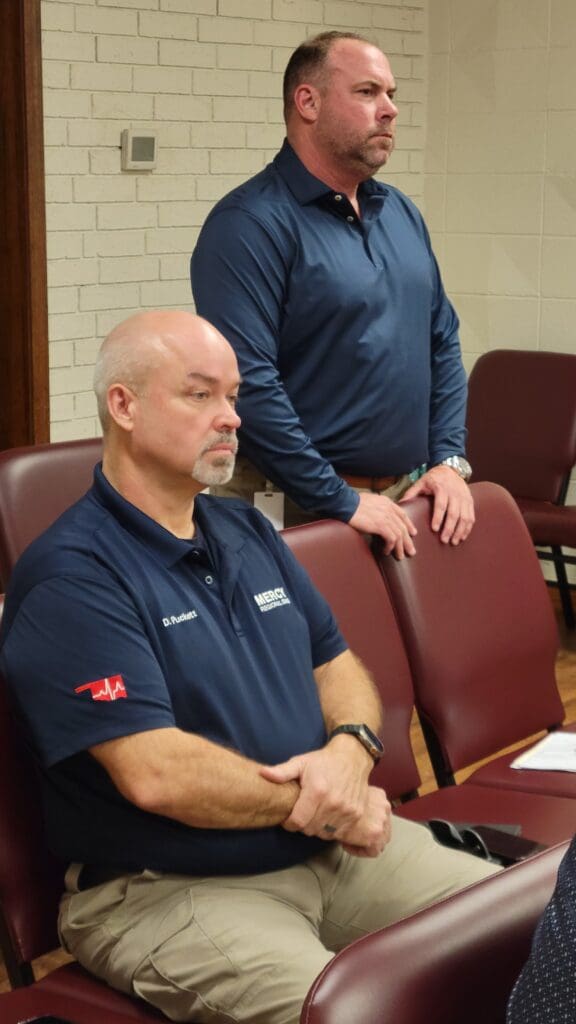 Mercy Regional EMS owner Duke Dixon address the board. Seated, David Puckett Director of Operations.