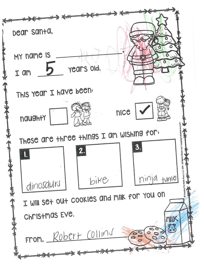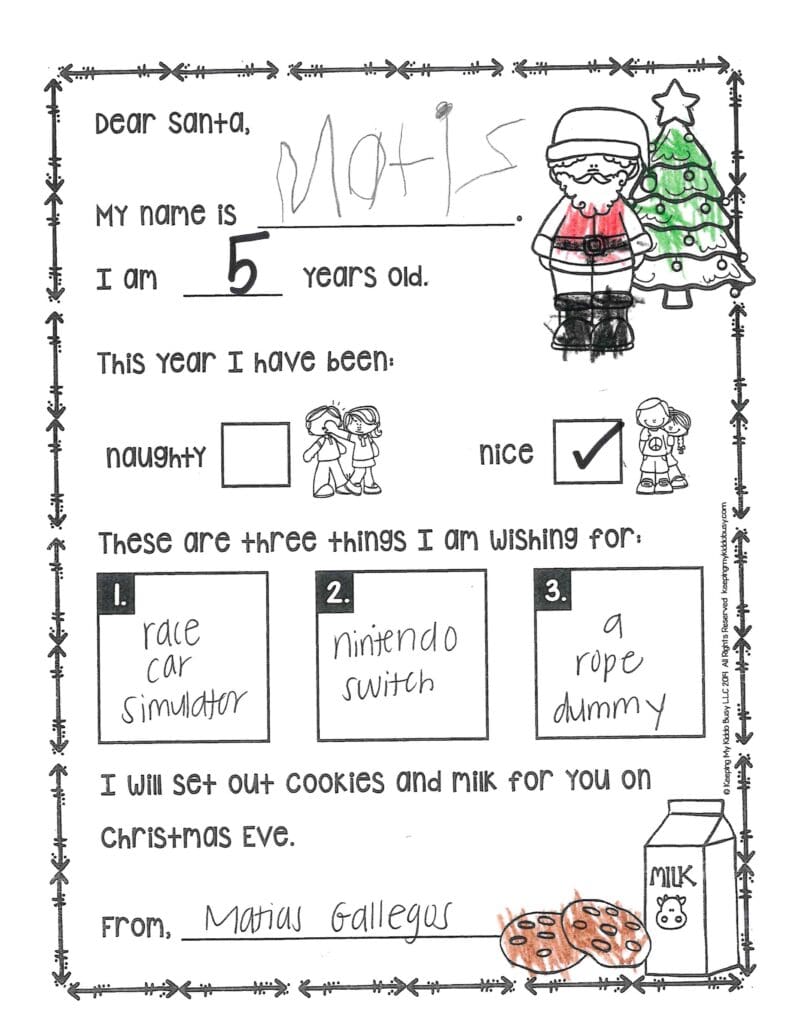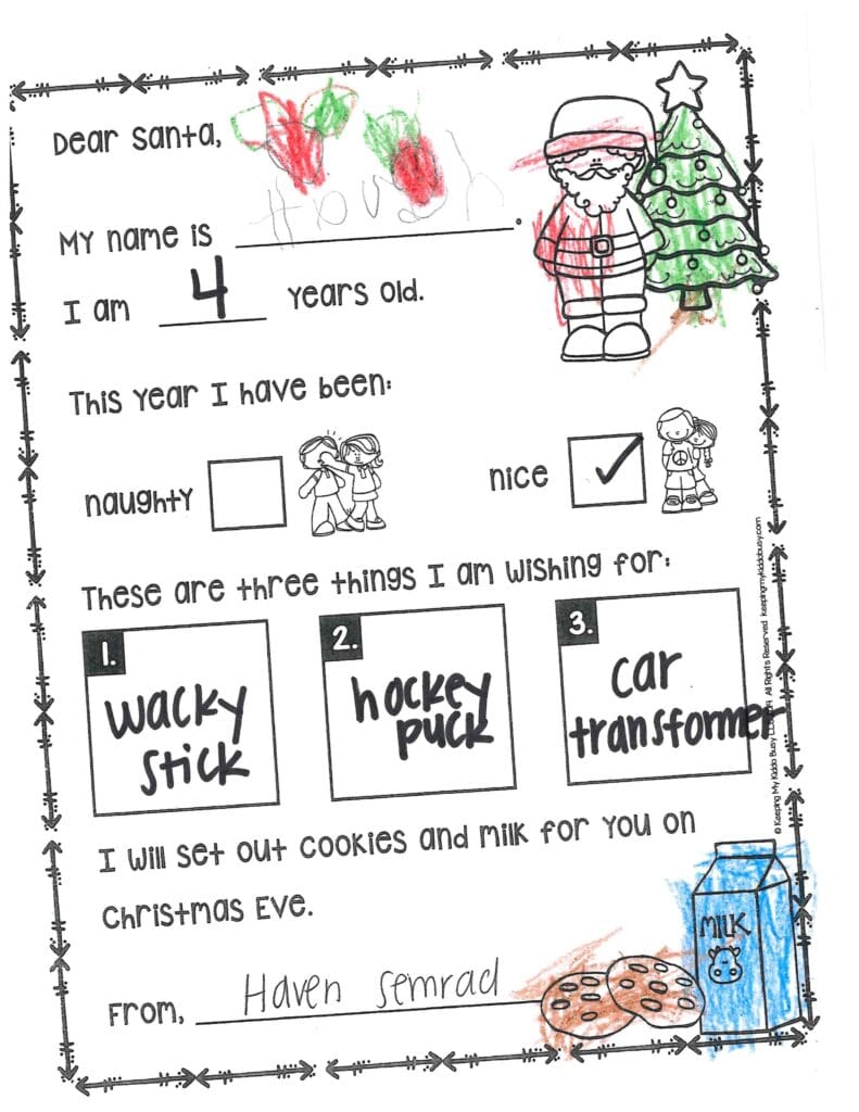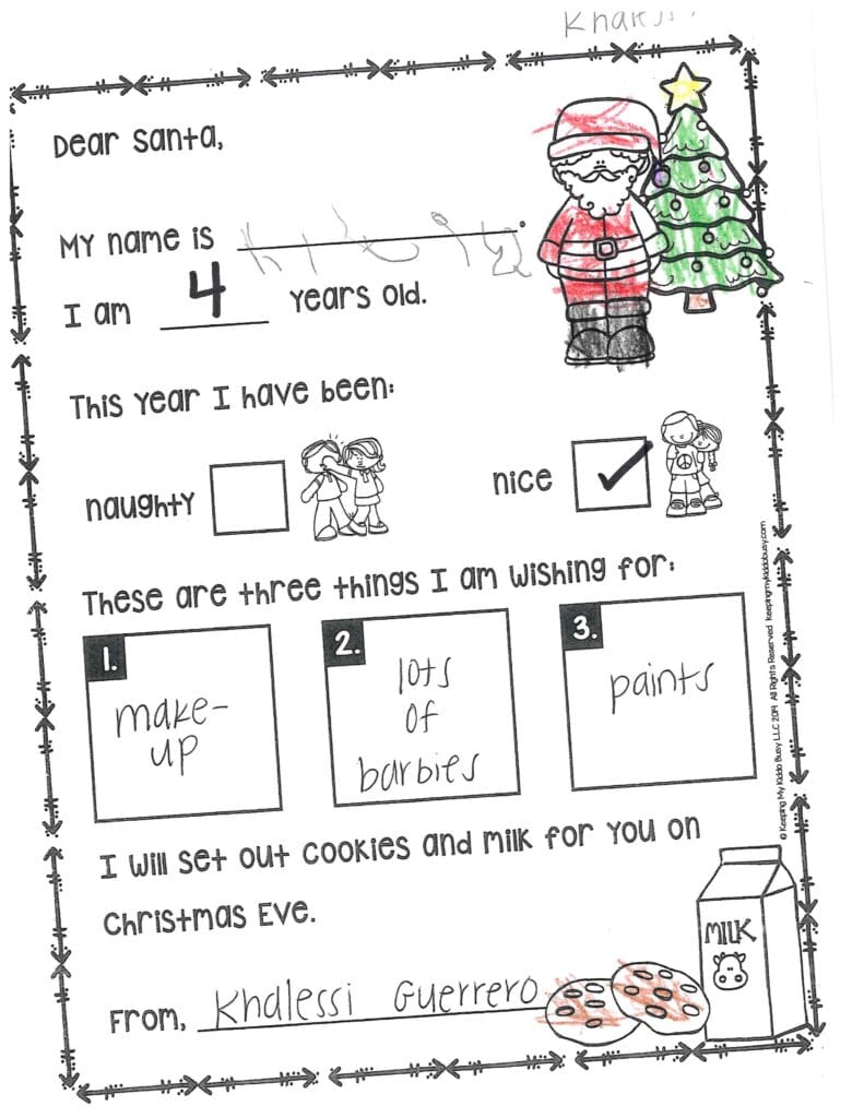 Where did you get those reindeer? What kind of sleigh do you drive? Thank you for getting us Disney World tickets last year. Santa, please get me clothes, shoes, a phone, watch, slime, earrings, and Robux. Can you get Mckenna some Robux? Santa please don’t eat a lot of cookies and be safe.