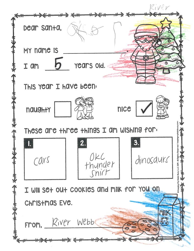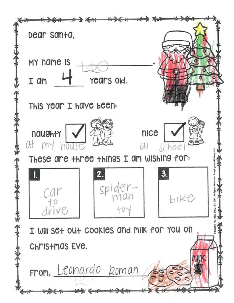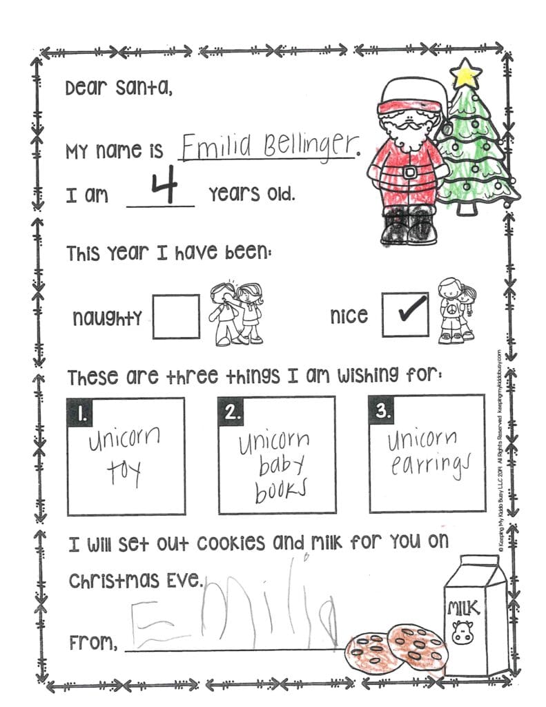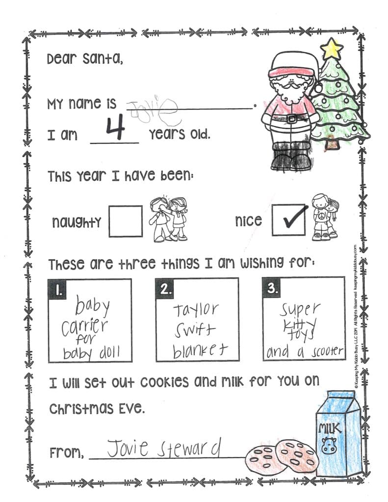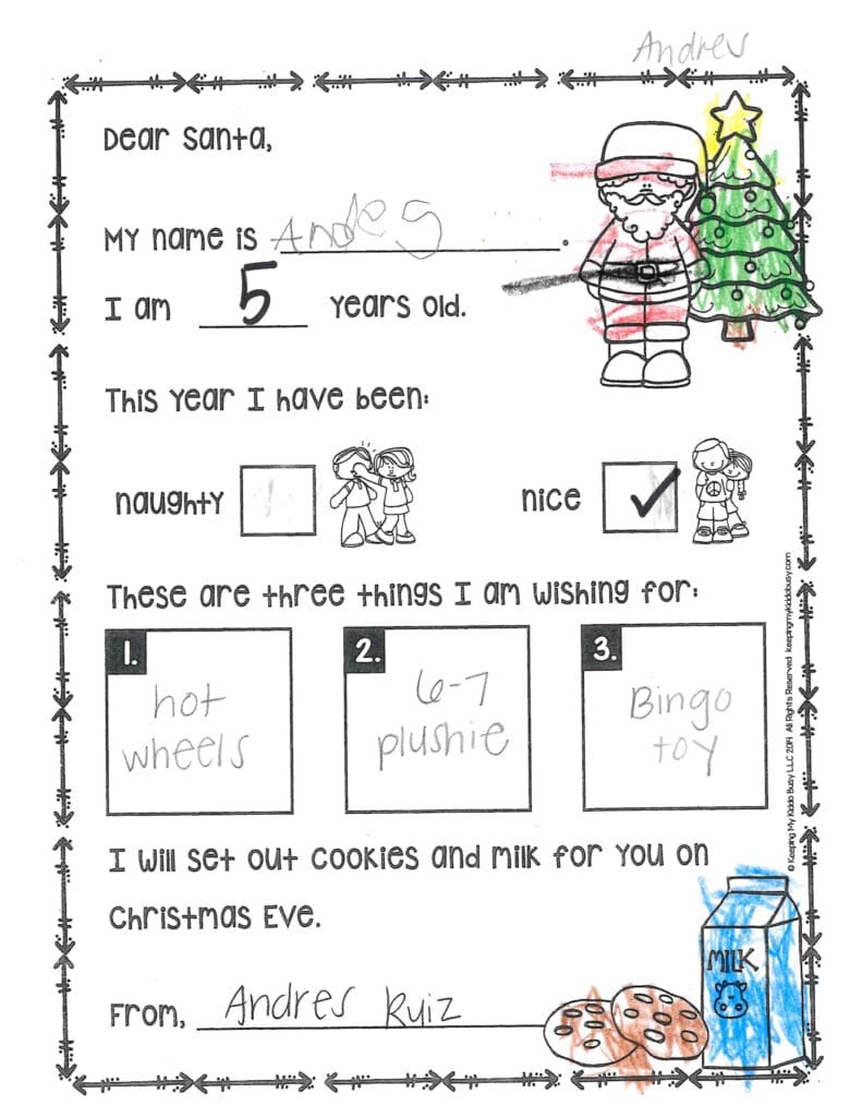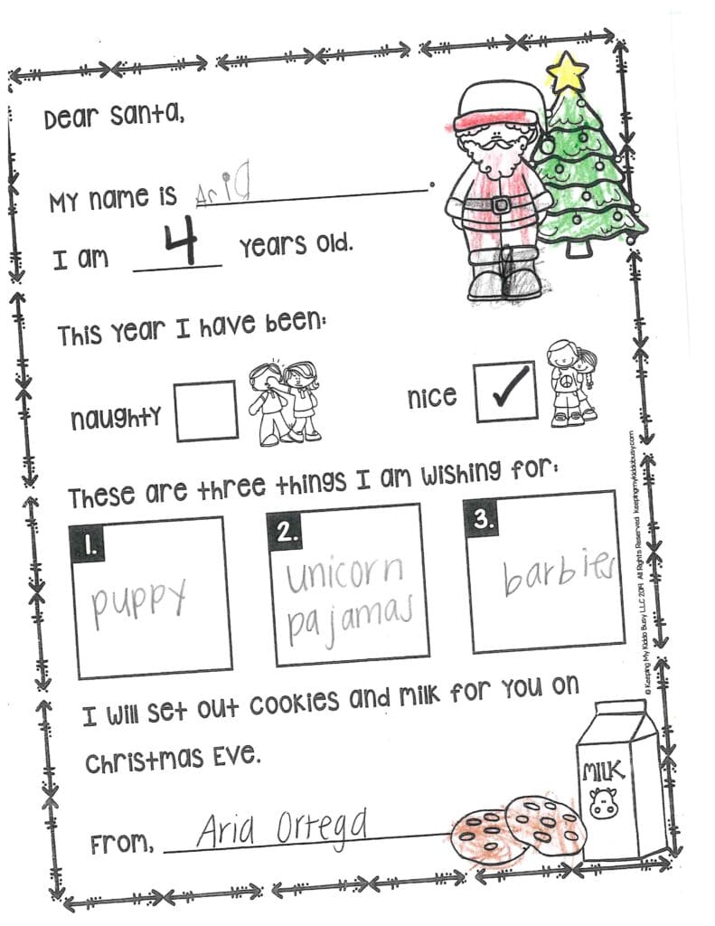 My favorite cookie is chocolate chip. What’s your favorite? How do your reindeer’s nose get red? I like the clothes you gave me last year. They are so warm and cozy. Thank you! This year, I need pants please, and I want a new backpack and water bottle. Can you get my mom a new Christmas stand? Be careful on the way back to the North Pole.