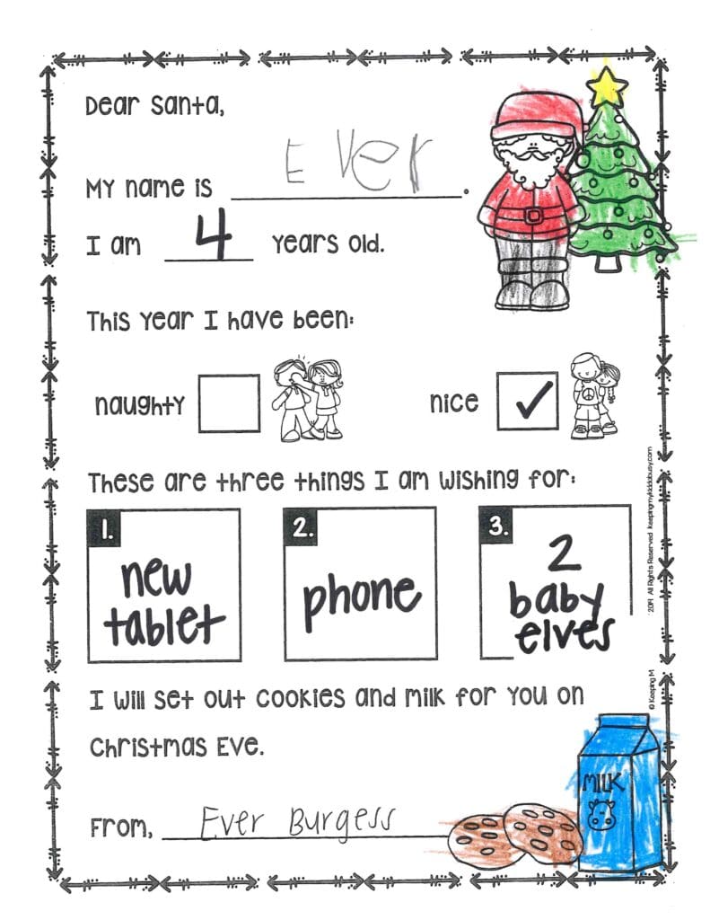 Do you like my red velvet cookies? How many elves do you have? Thank you for my TV last year. I would like a phone, Aerial silks, a hoverboard, and cloud slime. I need new clothes and I want you to give a watch to my sister Harper. Santa please don’t eat too many cookies and get a tummy ache.