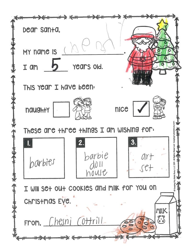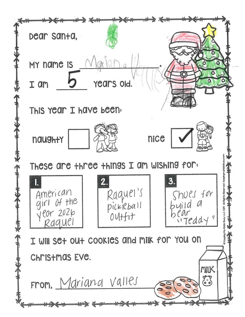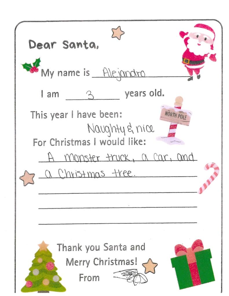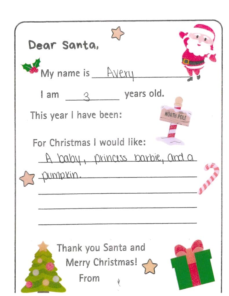 Who is your favorite reindeer? Could you maybe send me a girl elf? Thank you so much for the gifts last year. I would really, really like a PS5 to play with my best friend Anzli. I really need a new basketball goal. Could you send Anzli some mascara, blush, and perfume. I wish you a Merry Christmas and safe trip back to the North Pole. I hope you don’t get a stomach ache from all those cookies.