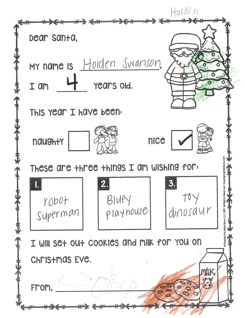 How many cookies do you eat each year? What is your favorite kind? Thank you Santa for the Nintendo Switch and bike last year. Santa please, I wish for a VR headset and a free card for Wendy’s. I wish for Parker to have a new football. I hope Santa doesn’t stop at the store and eat too many cookies.
