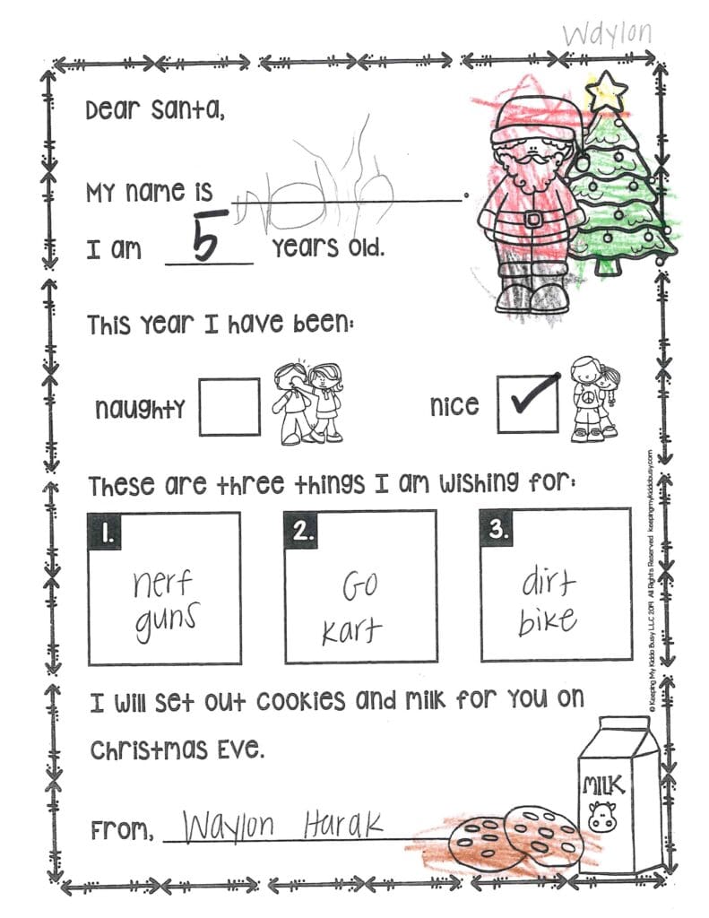 What do you like to do when it is not Christmas? Do you like to cook with your family?Thank you for my hoverboard last year. I love it! I would like a new pair of roller blades and I need colored gel pens. I think that Emilee should get more rubber bands for her beautiful hair. I hope you have a safe trip and don’t get a tummy ache. You are the best!