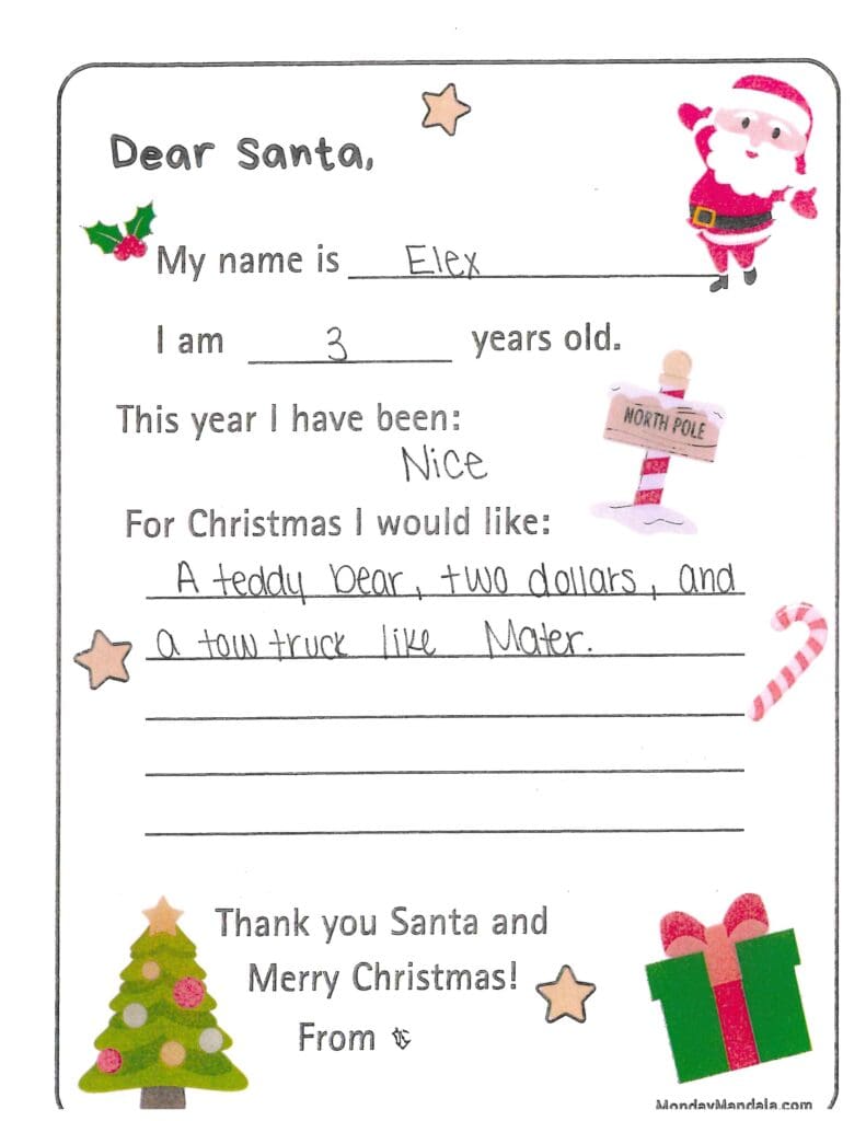 How have you, your elves, and reindeer been? Have your elves been good? Thank you for the mini couch you gave me last year. I would like a pack of softballs, a basketball and I need some long sleeve shirts and socks. Ezra wants some perfume. Have a safe trip.
