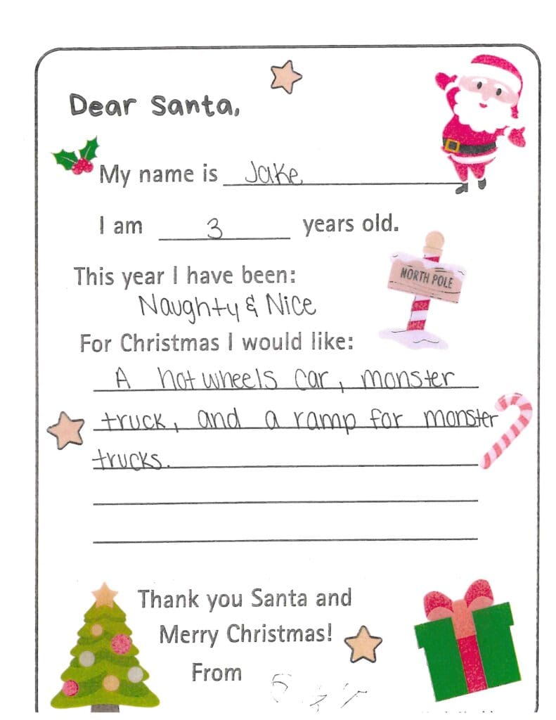 Are your reindeer doing good and have the elves been helping you? Thank you for all the gifts you gave me last year, like the watch. This year for Christmas I would like a fanny pack, bracelet kit, and a new Owala. I need new jeans and sweatshirts. I think my dog would appreciate some dog toys or clothes. I hope you have a safe trip, and don’t eat so many cookies so you have room for mine.